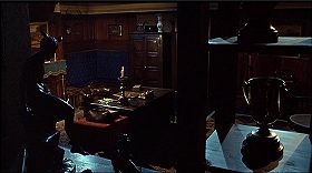 | 書斎のようです。扉が画面左に映り、ハミルトンは右へ回って数段おりて手前へ来る。またカメラの前を横切って左奥へ、机の向こうでこちら向きに坐ります。これも1カットでした。 次いで土俗的な仮面をかけた右手の壁をノックします。どうやら隠し扉になっているようです。扉の向こうがどう続くのかは残念ながら映されません。 |