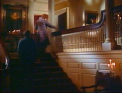 | やや左下に下りていく階段が俯瞰されます。おりたすぐ向こうに扉がある。階段の右下は1階で手前へ伸びる廊下のようです。オレンジ味のある赤服の娘(後に名をダフネと知れます、リサ・ブレイク・リチャーズ)に、別の娘(後に名をマギーと知れます、キャスリン・リー・スコット)が、デヴィッドというおそらくは子供を見なかったか尋ねます。 | |||||||||||||||||||||||||||||||||