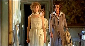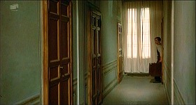 | 侯爵夫妻のもとに秘書が訪ねてきます。 宿屋の食堂です。秘書をカモにしようとする村人の一人にポランスキーが扮していました。口ひげを生やし、ベレー帽をかぶっています。 前の通りで12~13歳の娘が車にはねられてしまう。秘書はその血をパンに浸し、伯爵のもとに持参します。 館の食堂です。騙し絵が壁に描かれている。 娘たち、おそらく長女と四女の部屋らしい。大鏡があります。 次女と三女の部屋です。左に扉、正面奥の壁にも扉があります。後者を開けると、2段ほど上がって別のがらんとした部屋につながっている。突きあたりに青みを帯びた窓が見えます。手前の部屋の暖色と奥の部屋の寒色が対比されるのは、ドラキュラ城の地下室と同様でした。 そこで待っていたマリオが入ってくる。ロシアで革命が起こったとマリオはいいます。とするとこの話は1917年以降ということになるのでしょうか。四女が14歳であることがわかります。マリオとの事が終わった後で姉妹はキスしています。 約42分、侯爵一家が伯爵を待っています。 |