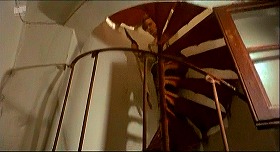 | のぼり階段が上から見下ろされます。さほど幅は広くない。階段の下正面の壁に茶色の扉が見えます。右側にも白い扉が開け放たれており、そこから伯爵と秘書が入ってきて階段をのぼります。 | ![]() |