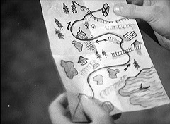 こちらは『わが青春のマリアンヌ』(1955)で、「盗賊団」が主人公を呼びだす際、つけてあった絵地図です(→そこの2)。 | ||||||||||||||||||||||||||||