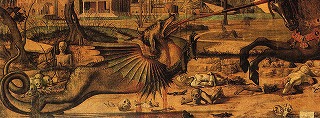 | 犠牲者の屍骸がごろごろ転がっているせいか(右下)、後にモローが模写することになる( →『ギュスターヴ・モロー研究序説』[7]中の「Ⅲ-2 生贄たちの眼」でも触れました)、 カルパッチョの《聖ゲオルギウスと龍》(1502、サン・ジョルジョ・デッリ・スキアヴォーニ同信会館、ヴェネツィア):右上 →日本語版ウィキペディアの該当頁 もここに加えられるでしょうか。このドラゴンは肢が四本あり、前肢の肩からはえる翼は21本の骨によって分割されています。尻尾も「くるんと」一回転することを忘れてはいません。 |