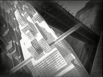 | 抑圧された労働者と特権階級の対立という物語上の主軸からはほぼ遊離してしまうほどの訴求力を発する、さまざまな未来都市とその崩壊のイメージ、それらに対して物語を収斂させるための舞台として選ばれた昔ながらの教会、反発するのか裏表なのか、両者の関係には何やかやと意味を読みこみたくなるところではありますが、ここでは多様に分岐する空間の感覚に注目しておきましょう。 なお、本作とともに工場映画と呼びうるのが『宇宙からの侵略生物』(1957)です→こちらを参照:当該作品の頁。 (追記:本作における工場のイメージはチャップリンの『モダン・タイムス』(1936)やジャック・タチの『ぼくの伯父さん』(1958)に引き継がれているようにも思われます。また本作とは違うものをと原作者に要請されたという『来るべき世界』(1936)も参照)。 |