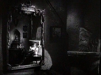| 夜、兄と大佐家の召使いが逢瀬を重ねているのは広間の階段をのぼったところにある部屋です。召使いはハープを奏でながら歌を口ずさんでいます。ちなみにこの映画ではここまでに、村の酒場ではツィター、大佐邸では大佐の姪がやはりハープと、楽器が三度にわたって登場していました。 さて、画面左の方には柱とそこから右に伸びるアーチがあります。柱の奥には暖炉があり、そのそばに召使いがいます。柱の左の壁には鏡がかかっていて、坐る兄が映っている。カメラは左から右へと移動します。まず尖頭アーチの下の凹みに半円アーチの縦長の窓が二つ、畳んだカーテン、次いで大鏡が置いてあります。こちらの鏡にはハープを弾く召使いが映っています。カメラはさらに右を向き、扉、そして左からおりてくるアーチとその柱、その前に坐る兄を映すのでした。左のアーチと右のアーチはつながっているのかもしれません。 |
