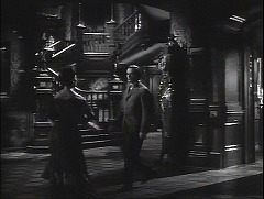| ジョージは戻ってウィルバーの妹ファニー(アグネス・ムーアヘッド)と暗い廊下を進みます。廊下の奥に階段上がり口の欄干がのぞいている。天井の梁には滴状突起が垂れています。二人は前進、カメラは後退します。 | ![]() |