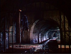 また次の通路は、右に寄せて映されいっそう暗い。手前の壁には水面が揺らめく影が映り、床にも水が漏れています。少し上りになっているようです。そこを奥から、怪人とヒロインがやってくる。 | |||||||||||||||||||||||||||||||