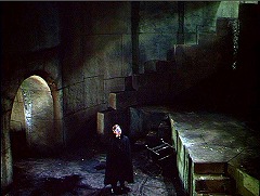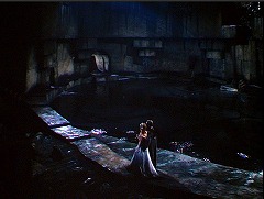 もう一度はさらに暗い空間で、舞台の下なのでしょうか、奥の壁には階段が右上から左下に下り、左下にはアーチ状の出口があります。手前には箱か何かが積みあげられているようです。そこに佇み、ヒロインが初の代役をつとめる舞台のある上方を見上げる怪人を小さく俯瞰で捉えたショットは、距離と待機の感覚を伝えます。 | |||||||||||||||||||||||||||||||