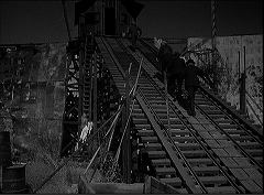 | その際、またヒロインをさらったカリスを婚約者が追う際、橋と接岸部の脇から下方におりるのですが、そこで映る橋の木組みも、縦の柱何本かにブロックごとに角度の違う横の柱が交わって、面白い眺めを見せてくれます。その後婚約者は犬のピーナッツに導かれて、丘を駆けおります。けっこう運動感があります。 |