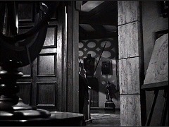 | 玄関扉は右側にあるようで、画面ではその奥に、格子状の影を落とした壁を経てずいぶんと立派な暖炉、窓をはさんで、食堂への扉と並びます。この扉の上あたりに最初、斜めになった手すりが右下がりでおりてくるように見えるのですが、これは影だとわかります。また後の場面で見ると、扉の上に額絵とともに、上ひろがりの直線が2本伸びており、これは槍か何かのようです。 食堂の扉の向こうは渡り廊下の下にあたります。ここも奥へ続いていく。その中には上辺が斜めになっているように見える戸口もあります。後の場面では、戸口の向こう、上の方に階段の手すりがあるとも見えるのですが、実物か影かはわからない。 ぐるっと回って階段の前まで戻ってくれば、その手前、左側に後で出てくる書斎への入口があるようです。 大まかな配置はこんな感じなのですが、この作品では家具調度も何かにつけ豪華です。2階にある寝室や渡り廊下などで、捻り柱が見受けられたりもします(追補:「怪奇城の広間」の頁も参照)。 |