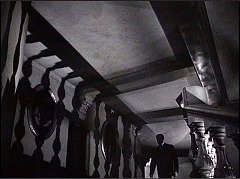| 階段を駈けおります。渡り廊下・階段双方の手すりはやはり大きな影を落としている。カメラは最初上から見下ろしつつ首を回してヒラリーの動きを追い、1階では水平の視線となる。これが1カットでとらえられます。 | |