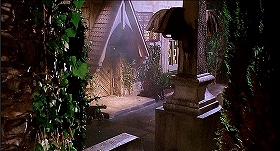 | カメラは右から左へパンします。松明のある短い壁の左、背の低い方形の出入り口となっている。その向こうは右上へ曲がりながらあがる階段がのぞいています。廊下と階段口の間に短い壁のあるところがたまりません。捻り柱ももちろんいいのですが、古城映画はやはり廊下とその屈曲だよねといったところでしょうか。 | ![]() |