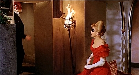 | 3人が話しているのを踊り場からカメラが見下ろすと、階段の上から赤い衣装の娘(イゾベル・ブラック)がおりてきて、途中で隠れるように立ち止まります。視線の先、向かい側の突きあたりにも飾り窓があります。とまれハマー・フィルムの他の作品と同じように、この玄関広間のセットも、かつてのユニヴァーサル映画におけるようにだだっ広くはないわけでした (追補:広間側から見て向かって右下の階段の親柱上にドラゴン像が載っています。これも『吸血鬼ドラキュラの花嫁』に出てきたものを用いているようです→「ドラゴン、雲形、魚の骨」の頁も参照)。 |