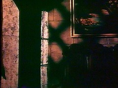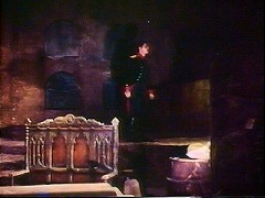 | 今回は夫人の部屋ということになっています。扉の左の燭台は蠟燭が赤い。 扉を突き破って中に入ると、男爵が現われこの男を追いだせと言う。男爵は「イルザ」と呟き、「私はここ」と答える声がありました。「あなたは私の命を奪った。今度はあなたの番」。 屋外でステファンがアンドレに銃を突きつけています。ちょっと前にはアンドレといっしょに行動していたのが、今度は男爵に忠実です。矛盾というよりここはステファンの揺れを読みとりたいところです。雷が轟き、礼拝堂の前にエレーヌが立っている。ステファンとアンドレの格闘が始まります。ステファンを殴り倒してアンドレがエレーヌを追おうとすると、老婆に出くわします。宙を鷹が舞う。老婆の目的は復讐でした。男爵は息子のエリックを殺した。今夜男爵は自殺という罪を犯す。 また正面から見られた広間の階段を男爵がおりてきます。構図は同じです。前回はガウンをまとっていましたが、今回は正装です。玄関からステファンが駆けこみ、止めようとするが殴り倒されます。男爵は隠し扉へ向かいます。 ステファンは玄関に戻ります。出たところでアンドレに出くわす。すぐ後ろに老婆がいます。ステファンは20年前に死んだのは男爵の方で、エリックはその後の20年間、身も心も男爵になったのだと告白します。老婆は2人とも死んでしまうと叫ぶ。ステファンは海から墓所へ水路があると言います。 ステファンとアンドレは玄関から格子戸へ急ぎます。奥を右へ曲がる。隠し扉は中から鍵がかけられている。ステファンを残し、アンドレは礼拝堂の方から入ろうとします。男爵が地下の廊下を右から左へ進む。アンドレは老婆も連れて行こうとしますが、老婆は信仰が違うので入れないと叫んで逃げようとします。と落雷に撃たれ、燃えあがってしまう。 アンドレは礼拝堂のイルザの銘のある扉をこじ開けようとする。ステファンは隠し扉をやはりこじ開けようとしています。 半円アーチが枠どりをなす地下墓所です。前回同様男爵は踊り場をおりてくる。色が前回より暗めのような気がしました。気のせいかもしれません。柩の蓋を開きます。背後に右上がりの階段が見える。中は紅の布に覆われた亡骸が入っています。声がヴィクターと呼びかけます。「海水を墓地へ」。 ステファンが隠し扉をこじ開けることに成功します。 |