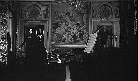 | とまれ彼が学会に出席すべく馬車で出発した後、ムリエルは手前にピアノのある暗い部屋でピアノを弾きます。ノスタルジックなフレーズが何度も反復されるモリコーネらしいメロディーです。 この部屋は奥の左右に扉があり、その間を大きな壁画が占めています。双方の扉の上にはメダイヨンが飾られている(追補:→「怪奇城の画廊(後篇)」の頁でも触れました)。 |