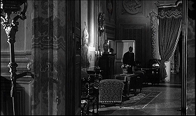 | 奥の敷居の向こうからムリエル(スティール)が現われる。光は暖炉の火だけのようで、この場面は全体に薄暗い。 | ![]() |