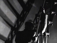 | 二度目の際には下からの光で壁に階段の影が大きく映るさまも、本篇の館内の場面の最後近くで落ちる、階段の欄干の妙に歪んだ影に応じていました(追補:→「怪奇城の高い所(後篇) - 塔など」の頁でも触れました)。 | ![]() |