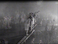 | 大蜘蛛のアップとともにタイトル・バックになりますが、その時映るのは蜘蛛の巣に覆われた館内の数カ所です。二台の車に乗った六人が道の迷った様子を描くところでは、霧の中、灯台の灯が見えると語られます。 底無し沼の場面を経て、「灯りが見える」という今日子の台詞とともに、 |