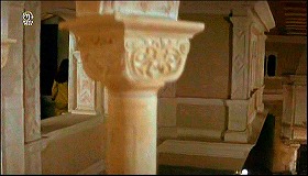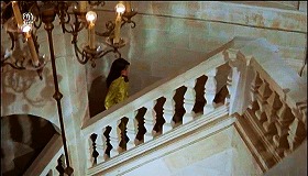 | 夫人がオルガンのある広間の階段をのぼります。白い大理石製です。その背を見かけた大尉のカットに続いて、カメラは左から右へ首を振りながら、上から見下ろします。階段は多角形をなして何度も折れ曲がります。あがった先を奥の回廊に進む。向こうには少佐の部屋があるのでした。 | ![]() ↙ |