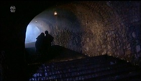 | 大尉が美術品を地下道に集めています。半円形のトンネルです。ワイン棚が見える。現われた少佐に、城からの脱出口で、いくつか出口があると告げます。地下道は後にも登場しますが、残念ながらその経路や出入口の様子は出てきませんでした。 | ![]() |