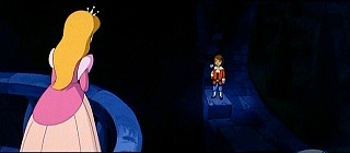 | 姫はペンダントを拾うべく、スカートの裾をつまんで階段を駈けおります。階段は途中で途切れている。そちらに気づいた魔王が途切れた階段を飛び越え、姫は階段の上の扉口から塔の中に駆けこみます。 宙空になった大きな塔の中では、規則正しく壁から突きでた柱が階段をなしています。『カードキャプターさくら 封印されたカード』(2000、監督:浅香守生)のクライマックスが連想されたりもする。姫と魔王が入った扉口から下へは、梯子が降りていました。魔王が姫を追い、鼠たちが魔王を突き落とし、刺客たちを振り切ったピエールが姫とともに塔の上へのぼる。 |
