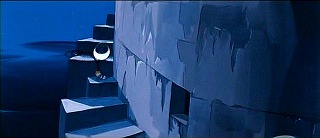この場面は魔王の城に関する前触れのようなもので、続いて王城の庭で姫がさらわれる場面に移ります。こうした配分も『オズの魔法使』を思わせる点でした。なお魔法の水盤は王城での噴水に対応しているのでしょう。 ピエールが白馬で駆ける場面をはさんで、たどりついた断崖の向こうに、約50分、魔王の城が全貌を現わします。それは有機的とも化石的ともとれる姿で、巨大な石の幹が伸びあがり、そこから幾本も石の枝が分かれてさまざまな角度にひろがるというものでした。枝の先には前に登場した時計のほか、小屋状のものがあったり、中には枝から柱が上がったその上に三階分の棟が建ち、上方で幹との間に橋がかかっていたりします。幹の部分にも階段や小塔がある。ガウディー風ととれなくもありませんが、もっととげとげごつごつした感触です(追補:→「怪奇城の肖像(完結篇)」の頁でも触れました)。 |