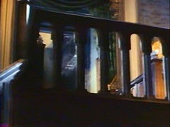 | 主階段へ、仰視するカメラが左から右下へ動く。テーブルの上のガラスの1つが転がり落ち、暖炉に達すると発火、屋敷は炎上するのでした。 画面は真っ暗になり、次いで玄関前の欄干が青で染まる。また真っ暗、そして青や赤に、ネガポジを反転させながら移っていく。 |