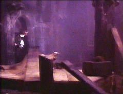 | 男爵は地面に残された布をとり、下からまた2階へ上がります。白衣の人物がもどってくると窓から布をひらひらさせます。これは原作13章の最後の方で旅の「モラヴィア人」がとった行動でした。 白衣の人物は壁の向こうの階段をのぼり、中2階を通ってまた壁の向こうの階段をのぼってきます。 |