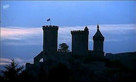 夜の城の外観が映る。城は丘の上にあるようです。冒頭とは角度が違っていて、3つの塔は間をあけて見えます。左の塔は上に鋸歯型胸壁、真ん中の塔も同様で、しかし右上に小塔がある。真ん中の塔と右の塔との間の城壁は左の塔と真ん中の塔との間のそれより高く、鋸歯型胸壁を走らせています。右の塔は上すぼみの台形の屋根で、左上に真ん中の塔のものより細い小塔が附属しています。 | ||||||||||||||||||||||||||||||||