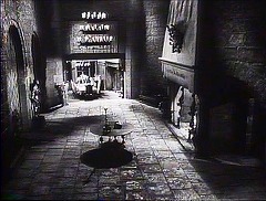 | その回転がインガの頭部に重ねあわされる。天井には格子の影が落ちている(追補:→「怪奇城の高い所(後篇) - 塔など」の頁でも触れました)。 村役場だか裁判所だかです。博士を弾劾する声がある。今も悪夢に見るという。調査のためにケンプ警部が赴くことになります。片腕が義手です。『復活』をなぞっているわけですが、ライオネル・アトウィルが演じた署長の威厳はありません。むしろ胡散臭さが強調されている。 |