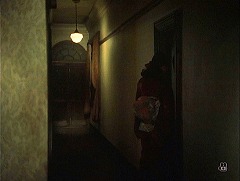 | 約1時間1分、小夜子と佐兵衛翁の恩人の縁者・野々宮珠世(島田陽子)が廊下を奥から手前へ進んできます。カメラは左から右へ振られる。奥に伸びる別の廊下が交わります。突きあたりには半円アーチ窓が見えます。左手前あたりは和風なのに対し、右あたりは洋風の壁紙が貼られていました。 | ↘![]() |