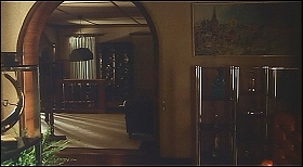 | 上の階ということなのでしょう、多角形をなすらしき食堂が映されます。大きな窓がありますが、やはり空き家相応の荒れ具合です。台所がこれに続く。 昼間の海辺を経て、玄関が開き、引っ越し作業員が荷物を運びこんでくる。扉は画面右奥に位置し、その手前には暗色と濃い黄色の縦縞に覆われたソファのセットが配されています。ソファは玄関に背を向けている。ソファのすぐ向こう、右手には天井まで伸びるらしき金属の枠があり、その左にもやはり銀色に光る、こちらは普通の棚が見えます。 作業員二人は左に進む。カメラもそれを追います。手前の柱越しになり、その左先にピアノが置いてある。さらに左は段差があるようで、左から手すりが伸びており、一番右側が降り口になっている。低くなった向こうには撞球台があります。その右には半円アーチの扉、奥に窓が開く。 |