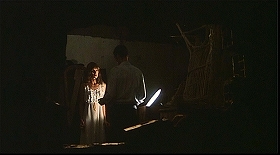 | 二人に左下からランプの光が強く当たっています。カメラは右から左に振られる。二人はやや上からとらえられます。 また穴の奥からの眺めです。ブルーノが手当てしようとしますが、ドーラは「放っておいてよ」と左へ消える。 ブルーノが振りかえるとドーラが鶴嘴をふりかぶっていました。 ドーラはブルーノを穴に押しこみます。穴の奥からのショットと外からのショックが切り返される。 ドーラがブルーノを入れるさまを穴の奥からとらえ、カメラは下に振られる。奥に丸いランプのみが残っています。右には純白の椅子か何かが見える。 |