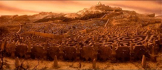 トビーは城にいると指させば、窓の外にひろがっているのは赤茶の景色で、ゆるやかな丘とそこを長々と横切る幾本かの城壁、頂に小さく建物が見えます。画面上辺は暗い木の葉が横に並んでいる。手前の城壁と城壁の間は何やらうねうねとうねくっており、これが迷路なのでした (追補:『バーバレラ』(1968)に登場した「死の迷路」と「夜の国の悪の都」との布置が連想されなくもありません→こちら)。 |
