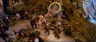 | 城内の玉座の間です。床には円形の浅いくぼみがある。壁には波打つ梁が二段になっています。奥に上りの階段がのぞく。ここにはゴブリン王とトビー、そしてゴブリンがうじゃうじゃいます。王は歌いだすのでした。 | ![]() |
