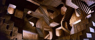 | 途切れた手前を見下ろすと、約1時間27分、上下左右が入り乱れたエッシャーの《相対性》風の空間です。ただしエッシャーの画面をそのまま再現しているわけではなく、武骨な石造の部屋になっている。 | ![]() |