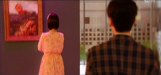 | 本篇中にも《キュクロープス》の出番はまだあります。第14話では、ダリではなくなぜかムハクの空想で、やはり独立した壁に飾られた《キュクロープス》の前に立つ女性にムハクが近づいていきます(右)。ムハクがなぜ《キュクロープス》を知っているのかは謎です。ただ最終回第16話のエピローグを予告する形になっているとは見なせるでしょうか。 | ![]() |