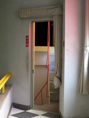 | その時は思い至らなかったのですが、体育館などの吹抜の壁に沿った通路なんてのもありました。右に載せた写真は、現在は解体された、ある公民館のホールの二階通路です。この時はある美術家によって、全館を使ったインスタレーションが公開されていました (栗本百合子、《記憶の遊園地》、阿久比町立中央公民館南館、2013.10.1~10.31)。 画面左の一階に見える青や、通路の手すり二段目の黄色は、作品の一部です。床の市松模様もそうだったかもしれません。 写真に映っていない手前は、二階の観客席です。また通路の奥に見える桃色に染まった扉口は(下左)、一階へ下りる階段と、数段上がって、演壇だか舞台上方のキャットウォークに通じていました(下右)。 |