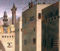 | ヤーコポの息子ジェンティーレ・ベッリーニの《サン・マルコ広場における聖十字架の遺物の行列》(1496、アカデミア美術館、ヴェネツィア)などでも、背景に数多くの点景人物が描かれています。ここではジェンティーレが手がけながら、完成を見ることなく歿してしまったため、弟のジョヴァンニが完成させた《アレクサンドリアでの聖マルコの説教》(1504-07、ブレラ美術館、ミラノ)を見ておきましょう(右1段目)。タイトルにある出来事は前景に描かれていますが、それ以上に目を引くのは、画面の奥、ほぼ左右相称で配された中央の建物でしょう。 「建築物の型は、ジェンティーレが東方旅行のさいに暗示を受けたものであり(前述したように、1479年に共和国の外交使節団の一員として派遣された)、マムルーク朝の建築様式に類似している」 (マリオリーナ・オリヴァーリ、篠塚二三男訳、『ジョヴァンニ・ベッリーニ イタリア・ルネサンスの巨匠 22 ヴェネツィアの画家』、東京書籍、1995、p.62。引用文中「前述した」とあるのは p.30) とのことです。その左右で、中央の建物に向かって後退していく建物群に、屋上や窓から前景を眺める人物たちを見てとることができます。 右の2段目は画面左上の部分で、手前から二つ目の建物の側面上方の窓や屋上、その右隣の建物、中央の大建築のすぐ左、オベリスクの向こうの建物それぞれの屋上に人の姿が見えます、また中央の建物の二階バルコニー左端の突きでたところにも人がいます。 右3段目は画面右上の部分で、やはり屋上や窓から人が覗いている。中央の建物のすぐ右の建物のヴェランダや、その奥、ミナレット でしょうか、塔上方の三段ある物見台にも人の姿が描かれています。 画面全体に対するこれらの人物の小ささゆえ、前景の主要場面を見ようとする視線に働きかけることもあまりありますまい。ところで絵を見る際、全体を一望できるだけの距離からの視点と、各部分を注視するために近づいた距離での視点とを往還するのは、どんな絵に対しても多かれ少なかれ行なわれるところでしょう。横が7メートル半以上あるこの作品であればなおさらです。もっとも縦も3メートル半近くになるので、画面上方の細部を確かめるのは、近づいてというわけにはいきません。ただいったんその存在に気がつけば、視線を注がずにはいられないのではないでしょうか。奥の建物のすぐ手前、左にいる駱駝(右4段目)や右手の麒麟に駱駝、犬(右5段目)なども同様です。とりたてて意味を持たされているとも思えない描写の細部によって、視線は散乱させられることになります(この作品の舞台はアレクサンドリアですが、ヴェネツィアと麒麟といえば、『幻の城』(1988、監督:ゴンサロ・スアレス)で、バイロンがヴェネツィア滞在時に住んでいた屋敷に麒麟がいました。史実にでもあるのでしょうか。→『フランケンシュタイン』(1931)の頁の「おまけ」でも触れました)。 |