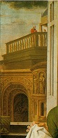 | ジェンティーレの弟子とされるカルパッチョの《聖ウルスラ伝》連作の内、市街を舞台にした第4作《婚約者たちの出会いと巡礼団の出発》(1495、アカデミア美術館、ヴェネツィア)などでも、背景に数多くの点景人物が描かれています。ここでは《リアルト橋での聖十字架の遺物の奇蹟》(1496頃、下左)を見ておきましょう。前景左の建物の一階とその附近や二階のヴェランダ、中景右のリアルト橋の中央にもたくさんの群衆が見られます。 他方右の遠景に目をやると(下右)、中央あたりの塔の右手前にある、屋根の上の物干し台、その右手の建物の左よりの窓、その手前の屋根、先の建物の一階分高くなった右手の窓などに小さく人物が描きこまれています。 |