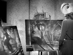 | さて、17世紀だった原作の舞台は映画製作とおそらく同時代に移され、服飾商だった主人公は画家になりました。その作品もちらちら映ります。当初は写実的な画風だったようですが、ある出来事が起こって以来、いわゆる幻想的なものが主軸となります。事後の最初の作品は、古城風の建物に、長く引きのばされた人物のシルエットがからむというものでした(約30分、右)。 | ![]() |