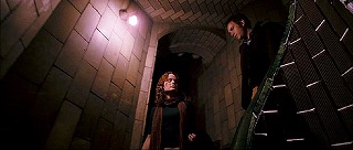| 余談になりますが、この映画では、何階分にも及ぶ階段が登場する場面が三度ありました; 一度目は約34分、サムと盲目のレオン博士がチェスをしていた近代的なビルで、踏面が半透明な青でした(右)。 二度目は約1時間7分、小劇場の狭い螺旋階段で、張りぼてめいた部分もある。一度途切れてすぐ再登場します(下左右)。 |