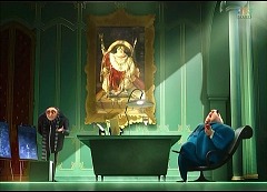 | ところでアングルには《ユピテルとテティス》の構図の先例となった 《皇帝の座につくナポレオン1世》(1806→そちらに作品の頁) があります。この絵を用いた映画にも出くわしました。3Dアニメーションの 『怪盗グルーの月泥棒』(2010、監督:ピエール・コフィン、クリス・ルノー) です。主人公が月行きロケット製作の資金を借りるべく、「悪党銀行 Bank of Evill」を訪れ、その頭取室に入る場面で、奥の壁にアングルの件の絵と思われる大きな絵がかかっていました(下左。下右はその部分)。ただし頭部は犬らしきものに替えられています。 アングルのナポレオン像を用いたのは、権威や権力を表わすためであり、しかしそれが犬になっているのは、そうした力を茶化しているのでしょう。 |