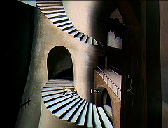 とまれ、迷路に囲まれたゴブリン王の城(→ここ)は、『オズの魔法使』や『ジャックと悪魔の国』同様、お伽噺ないしファンタジー圏内にあって、誇張された相貌を見せてくれます。 城に辿りつくまでの道程に比べると、残りの上映時間の少ないこともあってか、屋内は空間の数も少ない。それを補ってあまりあるといえるかどうか、エッシャーの《相対性》に倣った、上下左右の向きが混乱した部屋がクライマックスの舞台となるのでした。 |