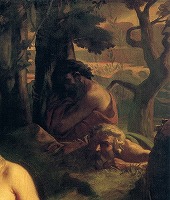 | 鳥に対して、サテュロスやケンタウロスのような存在は、より大地との繋がりの強いものであって、ここでも大地と同じ褐色で描かれ、殆んど見分けがつかない。岐阜の『ピエタ』(図175)においても、<証人たち>は地面の中から頭部だけ出しているようにしていた。その人物の一人との類似を指摘したシャセリオーの『スザンナ』(図135→こちら)について、モローがスザンナをより天的なもの、老人たちを大地に埋もれた、魂の低い部分と見るような解釈をしていたということも、考えられないことではない。ウェヌスがその姿を現わした原初の人類(図177)も、まだ自然から完全に分離していない状態にあり、その意味で人間の上半身と動物の下半身とで表わされるような、自然の精霊たちと近い位置にある。このようなサテュロスやケンタウロスを取り上げ、さらに単なる架空の存在、絵のアクセサリーに留まらず、そこに自然の原初的な活動の現われを見ることは、言うまでもなく古典古代以来の伝統に属するが、特にゲルマン系のそれ、ベックリンやフランツ・フォン・シュトゥックに好んで描かれた。モローにあっては彼らはより天上的な、理想的なものとの対比において、またその<証人>として取り上げられる。モローがこれらの存在を、より<低き>ものと見なしていたであろうことは疑えないが、それにもかかわらず、既に述べた彼のマティエールの<地中世界>的性格、上昇のヴィジョンの欠如などが指し示す、彼に対する強い大地の牽引が、これら自然の精霊たちに、単に乗り越えられるべき一ステップに留まらない、より共感深い、崇高でさえあるような性格を与えることになるであろう。ミケランジェロがその『勝利』像において、若者に踏みしだかれる老人に己れの姿を移し見たように、モローもこれら自然の精霊たちにその感情を移入させることになるのである。 |
