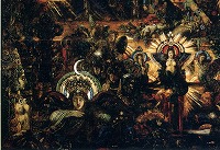 | この本の裏見返し二ページ分に、右上の素描からヘカテーを中心にした主要部分が掲載されているのですが、のどを軸にして左右相称になるよう、右はそのまま、左は反転してありました(右)。この内左側の反転した方を、『幻想の画廊から』の外函に用いたのではありますまいか。 もっとも、取り寄せたポジか何かを気づかず逆版で印刷したという可能性もあるので(その方が普通でしょう)、確実とはいえないのですが。 |